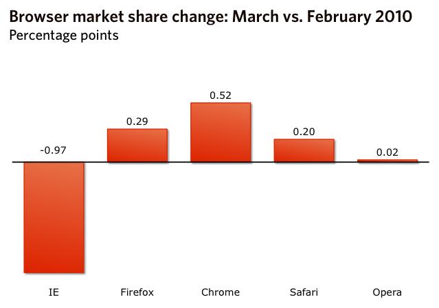 相比2月份,IE在3月份的份額下跌了0.93個百分點(從61.58%到60.65%)。Firefox增長了0.29個百分點,由2月份的24.23增至24.52。Google的Chrome依然是幾大瀏覽器中的佼佼者,增長了0.52個百分點。