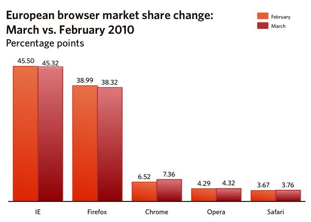 再來看一下歐洲瀏覽器使用2月份與3月份的差異,從中很難看出瀏覽器選擇界面有何突出作用。