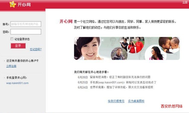 開心網由北京開心人信息技術有限公司創辦于2008年3月,用戶群體是辦公室白領。可提供包括日記、相冊、動態記錄、轉帖、社交游戲等社交工具。截止今年6月底,開心網注冊用戶數1.4億,月活躍用戶約為2000萬。
