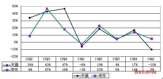 京東與天貓成交額2年來季度環比變化趨勢圖