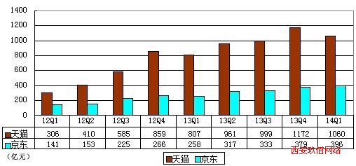 京東22日宣布其首次公開發行的93,685,620股美國存托股票定價為每股19.00美元,以此計算,京東估值已達到260億美元。 京東本次公開發行預計總共募集17.8億美元,假設承銷商不行使額外購買美國存托股票的期權,交易結束時募集13.1億美元,京東還將通過私募融資同時以首次公開發行價格向騰訊發行138,014,720股A級普通股募集13.1億美元。 京東IPO后無疑將獲得大量彈藥,與天貓的競爭也會更加激烈。來自國內分析機構易觀的數據顯示,在國內B2C市場天貓與京東正呈現兩強格局。 易觀統計顯示,2014年第一季度中國B2C網上零售交易份額排名:天貓 48.4%、京東 20.1%、QQ網購 4.7%、蘇寧易購 3.9%、易迅3.0%。天貓與京東與其他B2C差距在拉大。 從數據對比看,京東與天貓依然存在不小的差距,2014年第一季度天貓整體成交額為1060億元,同期京東為396億元,天貓為京東的2.5倍。過去2年這一比例基本維持不變。