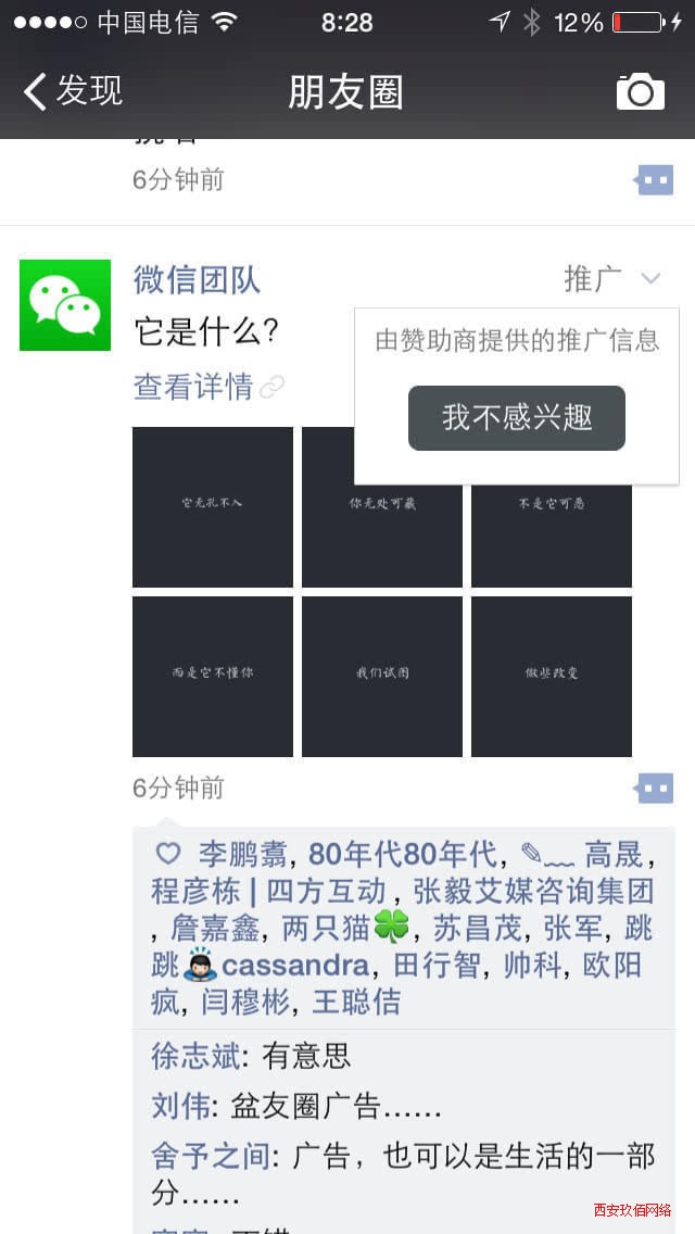 4.朋友圈廣告可評論、點贊。與正常朋友圈內容一樣,用戶可對內容點贊、評論,微信好友間可看見評論、點贊內容。