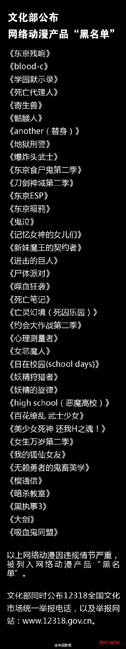 文化部還公布了一批違規網絡動漫名單:《東京殘響》《Blood-C》《學園默示錄》等一批網絡動漫因違規情節嚴重,被列入網絡動漫產品“黑名單”,任何單位和個人不得提供。