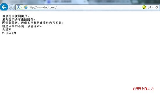 尊敬的大旗網用戶, 感謝您們多年來的陪伴。 因業務需要,我們即日起終止提供內容服務。 給您帶來的不便,敬請諒解。 大旗網 2015年7月