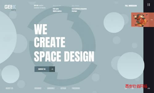 Geex Arts 在頁面的右側加入了一個黑色的垂直條,用一個小的暫停按鈕和小巧的動態圖片來吸引你切換頁面。小巧的導航被置于頁面底部。