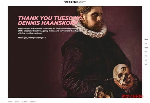 Weekend Creative Agency 的導航欄同樣置于側邊欄,不過是在左側,所有的鏈接都擺在明面上,但是從名稱到樣式都非常的簡約小巧。