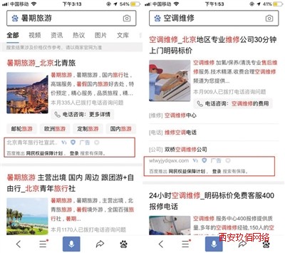 隨著暑期的到來,有用戶反映在使用百度App搜索“暑期旅游”、“空調維修”等關鍵詞時,在搜索結果中的廣告內容下方,除了原有的廣告標識外,新增加了一個藍色的盾牌型“保”字標識。用戶點擊該標識后,頁面內會彈出“網民權益保障計劃”的入口,繼續點擊可以進入網民權益保障計劃申保頁面。