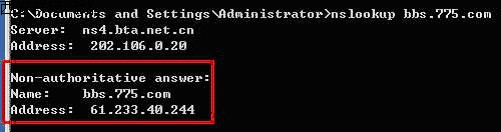 使用方法:nslookup+空格+域名,見(jiàn)下圖 adress項(xiàng)則為該域名或二級(jí)域名指向的IP地址。