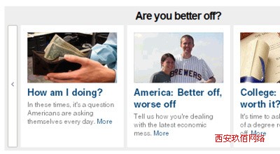 這種形式的好處是,用戶可以不用多次點(diǎn)擊來搜尋他們感興趣的內(nèi)容,可以快速的通過滾動(dòng)幻燈片來瀏覽希望他們注意的內(nèi)容。這種形式多用于娛樂站點(diǎn),或者是一些大型博客。是一種非常吸引眼球的展示方式。