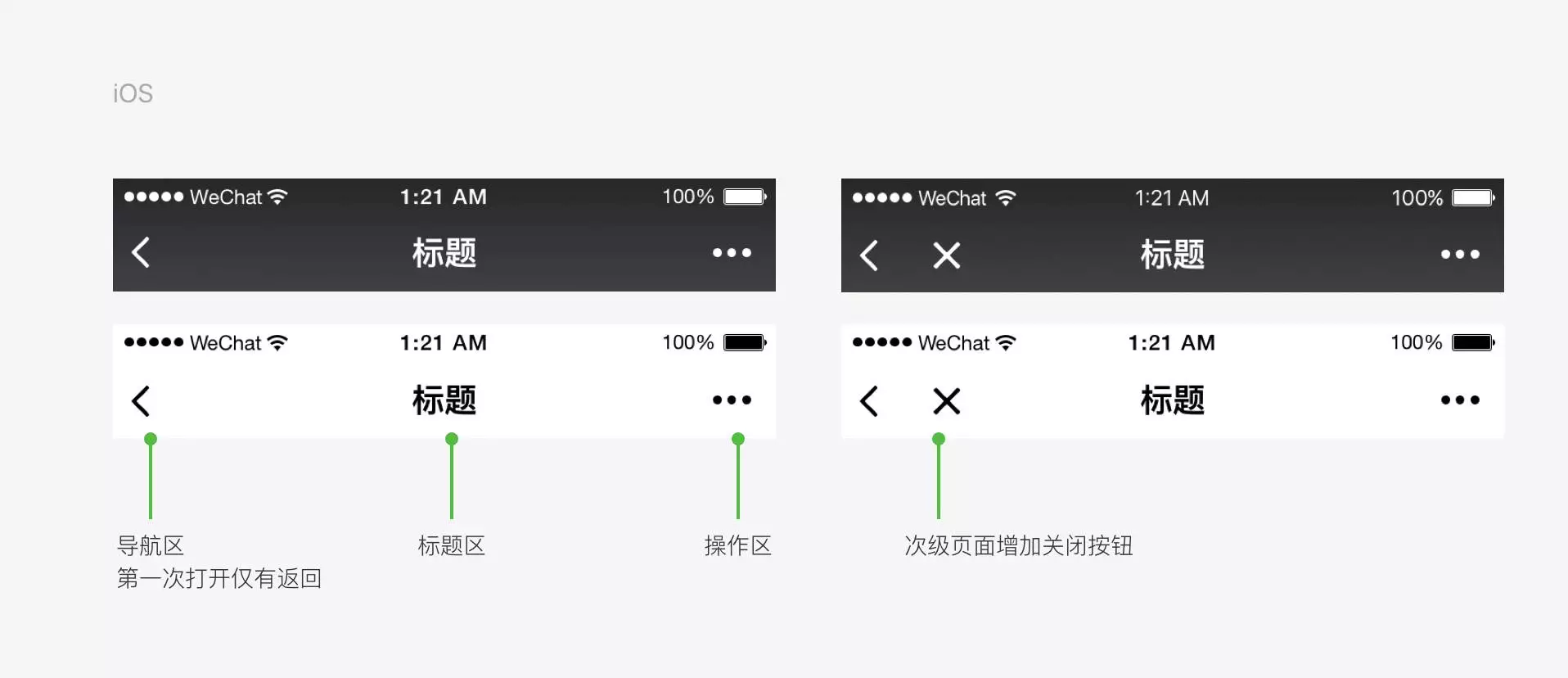 導(dǎo)航是確保用戶在網(wǎng)頁中瀏覽跳轉(zhuǎn)時不迷路的最關(guān)鍵因素。導(dǎo)航需要告訴用戶,當(dāng)前在哪,可以去哪,如何回去等問題。首先在微信系統(tǒng)內(nèi)的所有小程序的全部頁面,均會自帶有微信提供的導(dǎo)航欄,統(tǒng)一解決當(dāng)前在哪,如何回去的問題。在微信層級導(dǎo)航保持體驗一致,有助于用戶在微信內(nèi)形成統(tǒng)一的體驗和交互認(rèn)知,無需在各小程序和其他微信頁面的切換中新增學(xué)習(xí)成本或改變使用習(xí)慣。