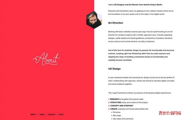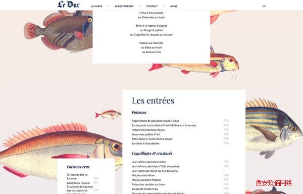 視差特效還能幫助設計師將更復雜的信息或者大塊的信息,分割成小份,讓它更加易讀,也更加容易被消化。當你設計隨著頁面運動的文本元素的時候,視差特效的這個特征會非常有用。不過在實際操作的時候,需要仔細斟酌內容的載體。 上面兩個網頁就采用了這一設計概念,不過在運用方式上略有不同。 Melanie David 的這個個人頁面采用了單頁設計,她將頁面的一半用作導航,當你滾動的時候,頁面的一側不動,另一側會正常滾動,當你完成閱讀之后,會自然切換到下一個內容區塊。 Le Duc 餐廳的網頁當中,設計師按照你的閱讀習慣和訂餐的方式,將菜單劃分為單獨的區塊。動畫很簡單,背景的魚起到了很好的裝飾性作用,用戶在瀏覽的時候,能夠更好地了解訂餐的信息。