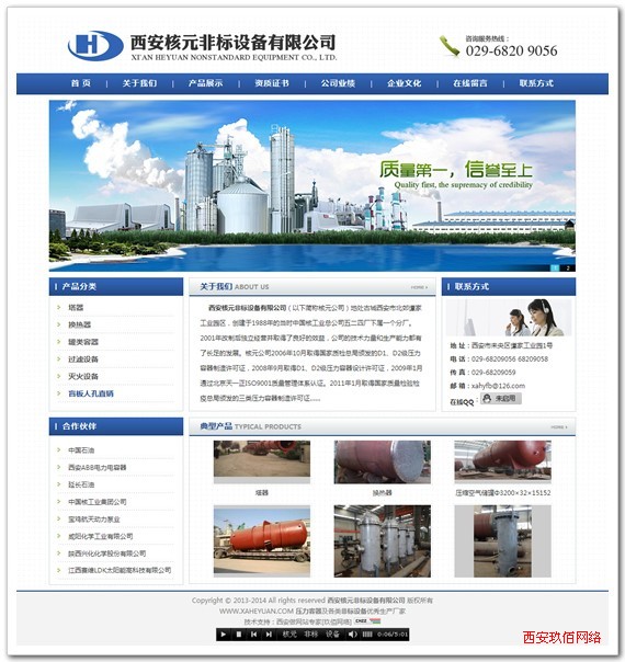 西安核元非標設備有限公司地處古城西安市北郊譚家工業園區,創建于1988年的當時中國核工業總公司五二四廠下屬一個分廠。2001年改制后獨立經營并取得了良好的效益,公司的技術力量和生產能力都有了長足的發展。公司自創建以來始終堅持“質量第一,用戶至上,及時交付持續改進”的質量方針,高度重視質量管理,及時周到地為客戶提供可靠的產品和滿意的服務,贏得了市場和廣大用戶的信賴。